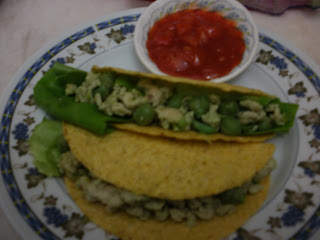 I use butterhead lettuce, green peas, minced chicken and for sauce I mix chop tomato, onion and chili sauce.